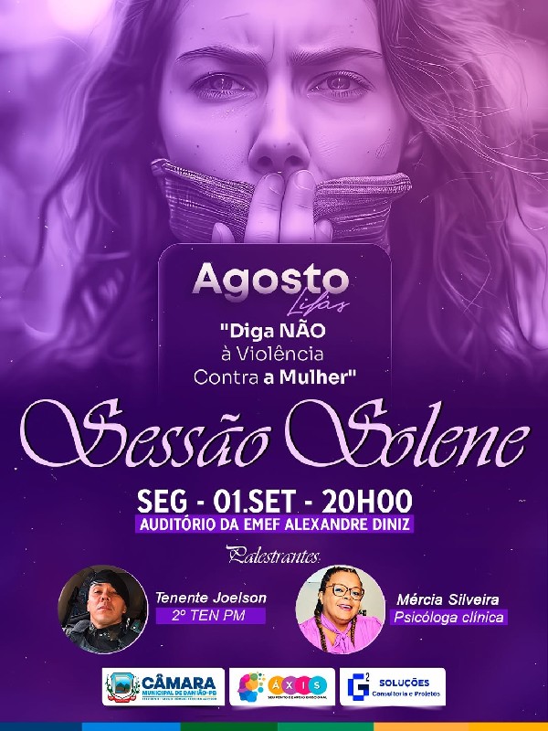 A Câmara Municipal de Damião-PB, em parceria com o eixo de apoio emocional da AXIS e a G2 Soluções, convida toda a população para a Sessão Solene em alusão ao Agosto Lilás, mês de conscientização pelo fim da violência contra a mulher.