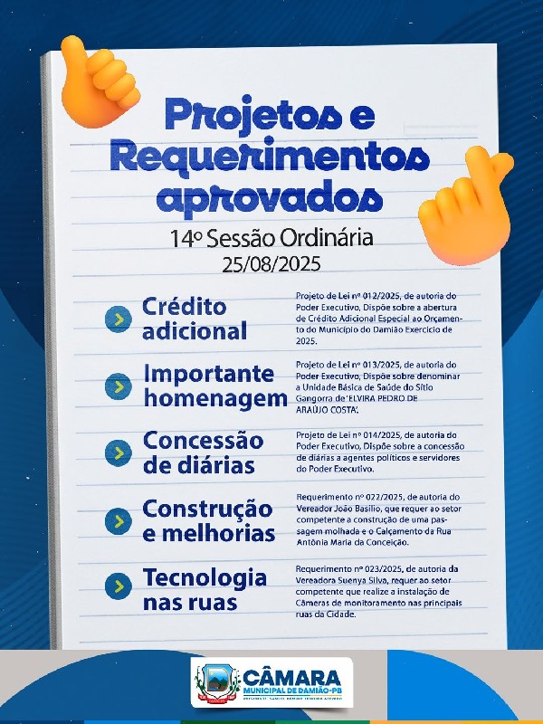 A Câmara Municipal de Damião realizou, no dia 25 de agosto de 2025, a 14ª Sessão Ordinária, com importantes avanços para o município por meio da aprovação de projetos de lei e requerimentos relevantes.
