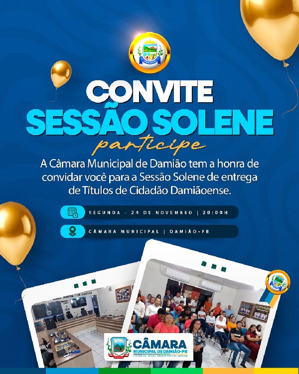 A Sessão Solene acontecerá na próxima segunda-feira, dia 24 de novembro, às 20h, na sede da Câmara Municipal de Damião-PB. Toda a população está convidada a participar deste ato de valorização, cidadania e gratidão pública.